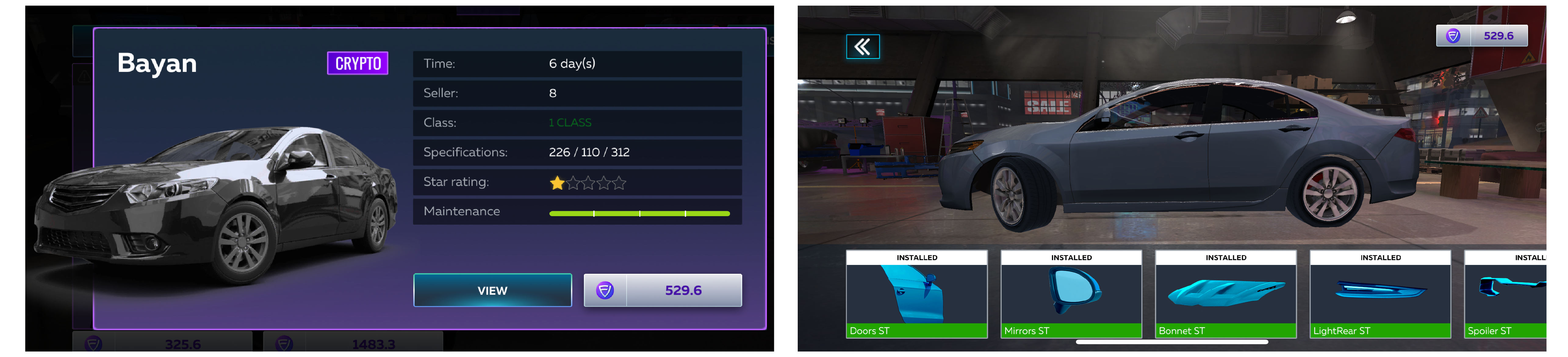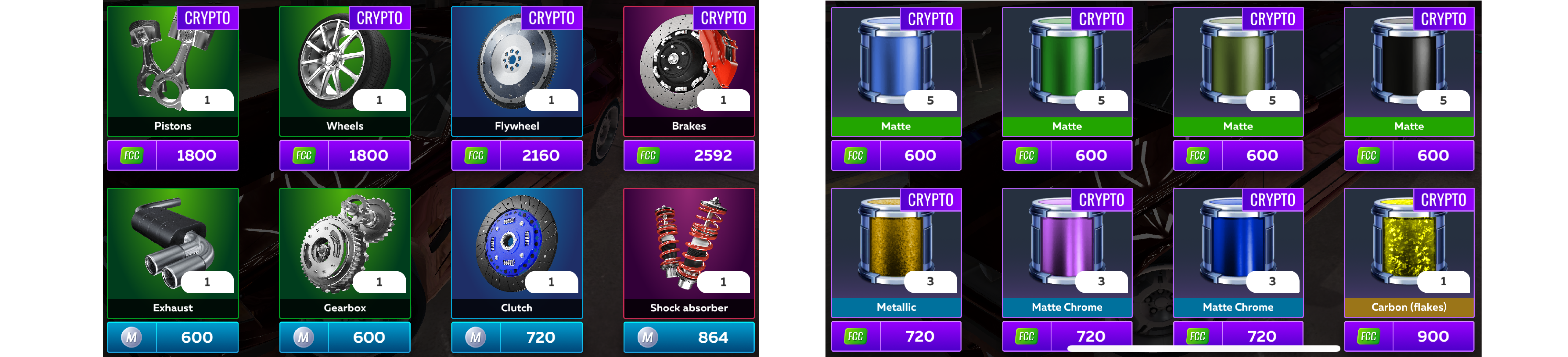 *Free-to-Play items can only be used for F2P cars, <mark style="color:purple;">Crypto</mark> items can only be used for <mark style="color:purple;">Crypto</mark> cars.*